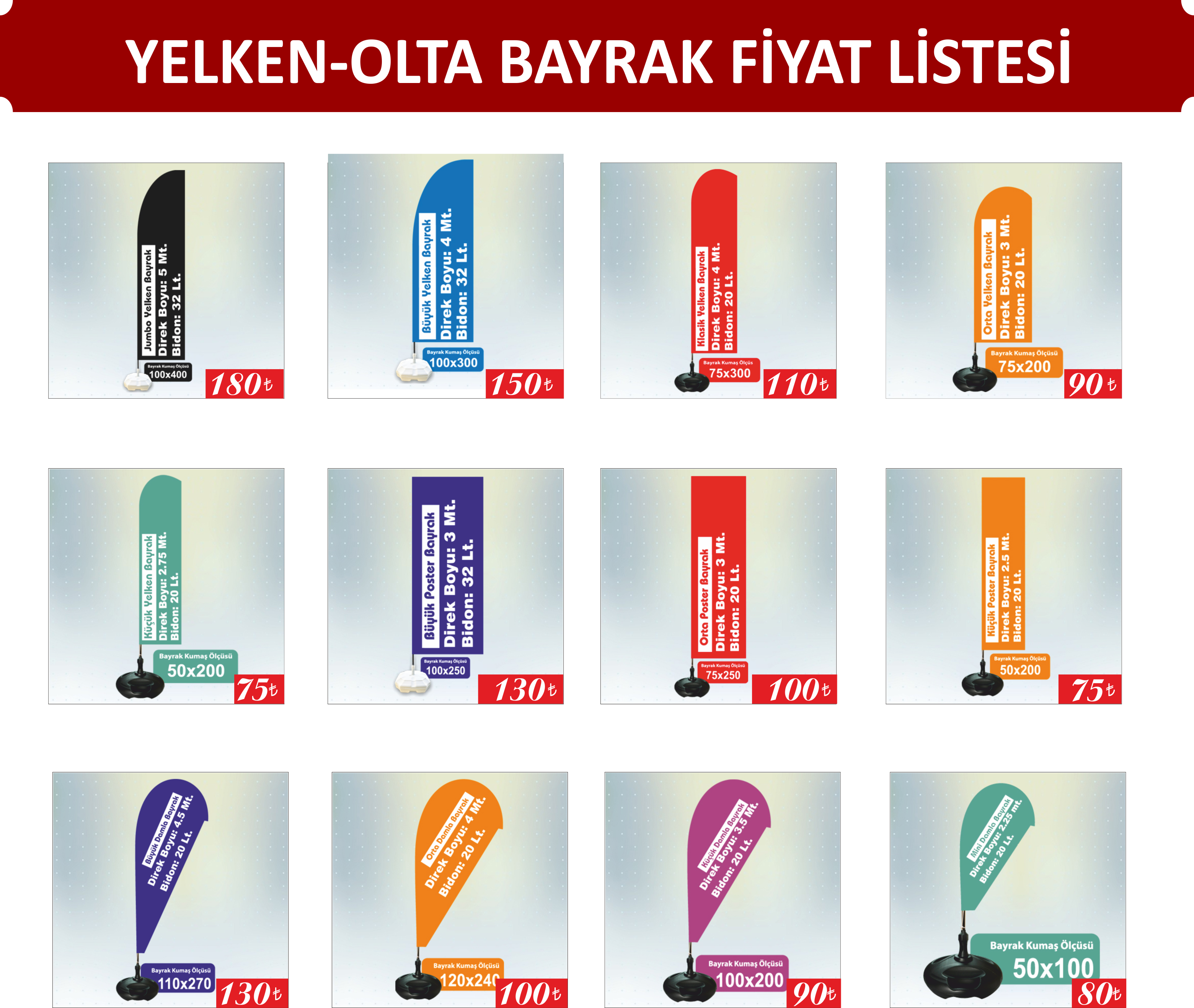 Olta bayrak kategorisi içinde Vertikal Bayrak, Japon Bayrak, Yelken Bayrak, Plaj Bayrak ve Damla Bayrak da bulunmaktadır. Talebe göre bu saydığımız tüm bayrak çeşitlerini üretebilmekteyiz